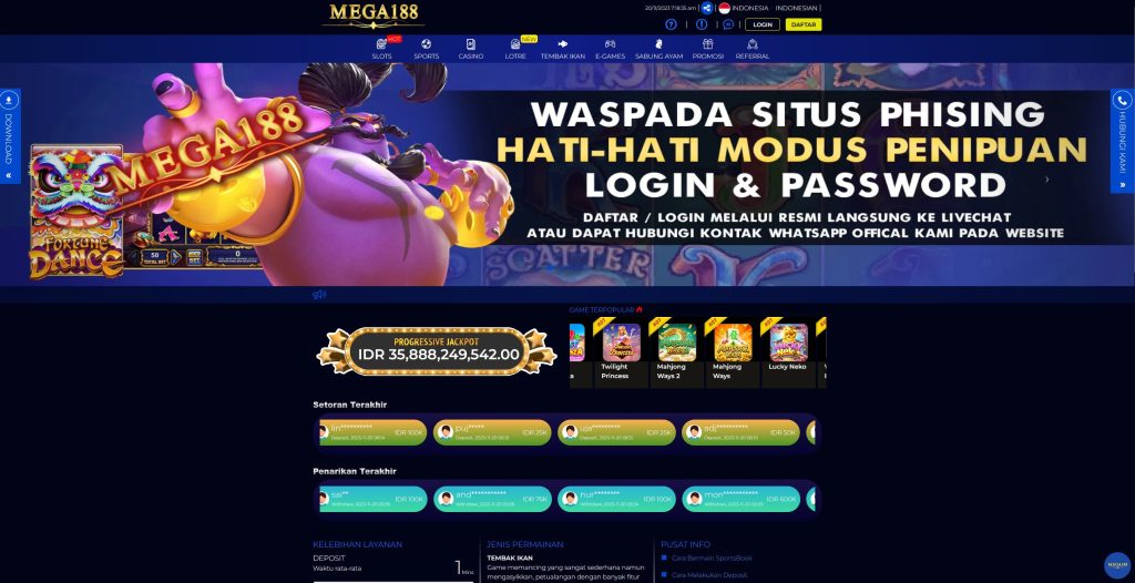 MEGA188 adalah rekomendasi utama bagi banyak bettor yang ingin menikmati pengalaman bermain slot online di Indonesia. Sebagai situs terkemuka yang menghadirkan berbagai permainan slot gacor, MEGA188 telah membangun reputasi sebagai tempat terpercaya untuk para pemain yang mencari keberuntungan dalam setiap putaran gulungan. Salah satu keunggulan utama MEGA188 adalah koleksi permainan slot gacor terbaik yang dapat ditemukan di dunia judi online. Melalui kerja sama dengan provider slot online populer dan berlisensi internasional, MEGA188 menawarkan ratusan judul slot dengan berbagai tema, fitur bonus, dan jackpot menggiurkan. Para pemain dapat merasakan sensasi bermain slot yang seru dan mendebarkan, sambil memiliki peluang besar untuk memenangkan hadiah besar.